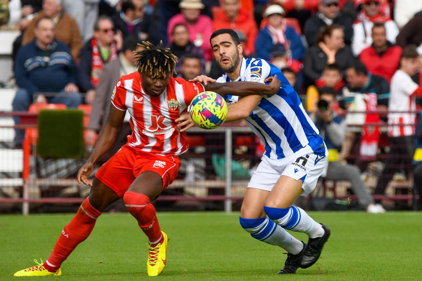 Así, en el minuto 15, Take Kubo avisó con un disparo cruzado, tras una mala salida de balón de Fernando, mientras que el Almería, impreciso en el pase, no inquietó a Álex Remiro, que no sufrió acoso y acrecentó su presencia en ataque.